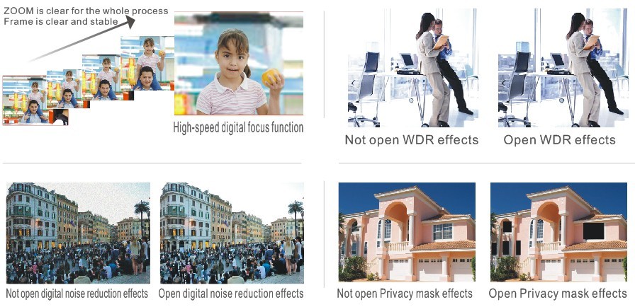 * 1/2.8" CMOS image sensor * WDR, Digital noise reduction , Light suppression * Digital high speed focus, continuous track * Super low illumination and power consumption.