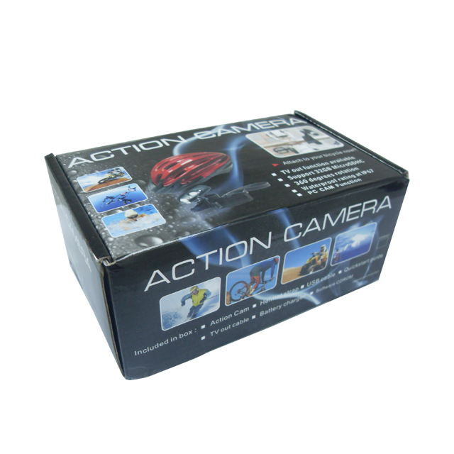 Package Contents: * 1 x Sports Camera * 1 x Buckle Bracket * 1 x Bicycle Bracket * 1 x AV-Out cable * 1 x USB Cable * 1 x English Manual * 1 x Driver CD
